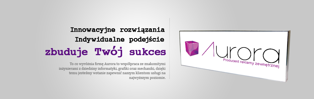 Aurora to firma świadcząca usługi w zakresie nowoczesnej reklamy świetlnej. Jesteśmy zespołem zdolnych oraz kreatywnych inżynierów, którzy za cel stawiają sobie pokreślenie ekskluzywnego oraz profesjonalnego wizerunku twojej firmy. Zajmujemy się dziedziną reklamy świetlnej pod każdą postacią. Oferowane przez nas produkty pozwolą na szybką oraz efektywną reklamę. Pomożemy ci zbudować silną oraz rozpoznawalną markę! Naszymi atutami są konkurencyjne ceny, specjalne oferty dla firm oraz dostarczanie zamówionych produktów na czas.